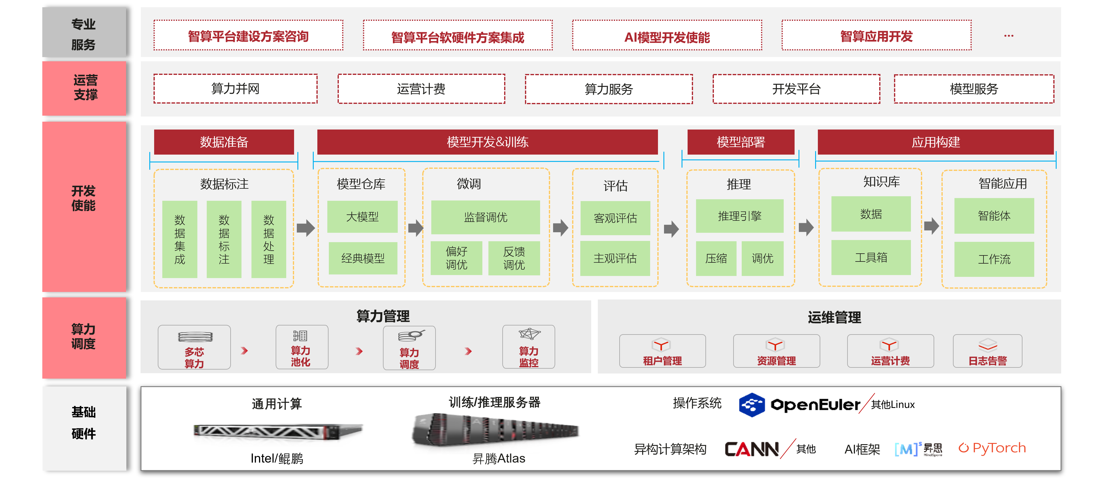 • 端到端AI工具链:覆盖数据管理标注、算法开发、大小模型训练推理、智能体开发全流程,支持传统机器学习与深度学习开发,实现AI资产统建统管。