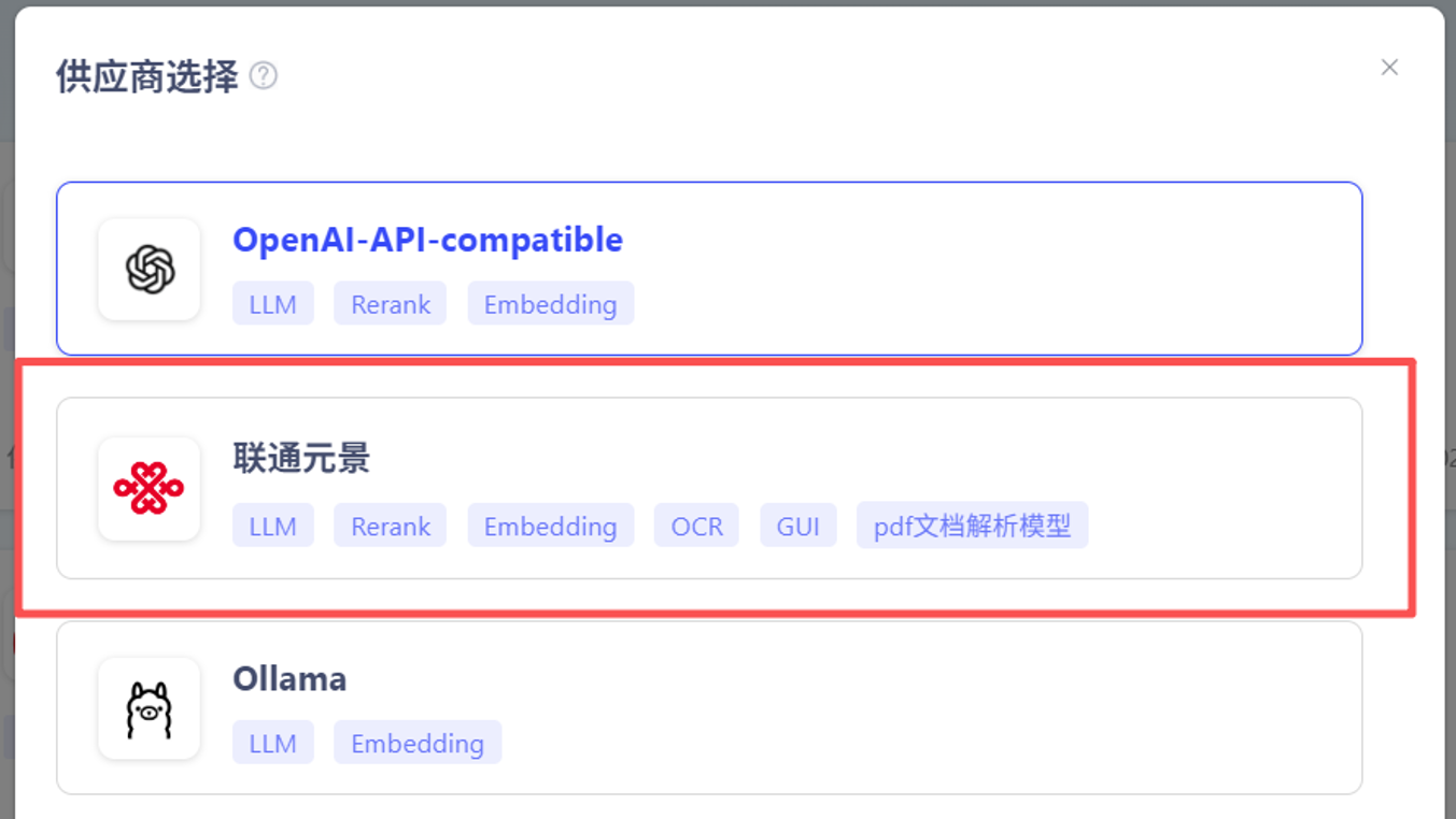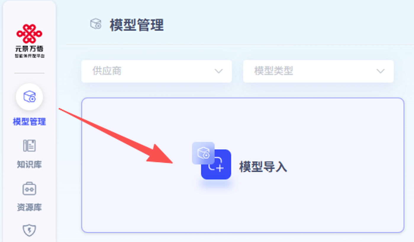 (1)导入服务:在元景万悟平台的【模型管理】中,新建模型服务,选择“联通元景”供应商。可接入云端或本地服务,具体如下: