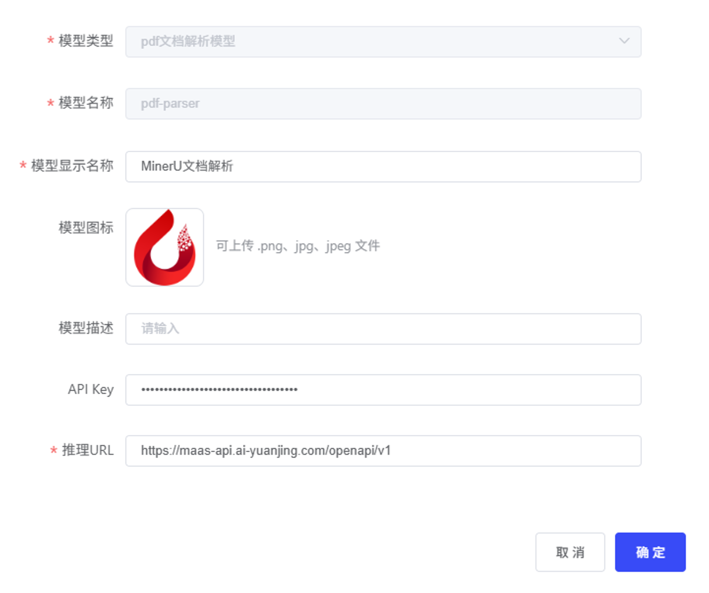 点击确定后,回到模型管理列表中可以看到刚才接入的:MinerU文档解析服务,表示已经接入完成。