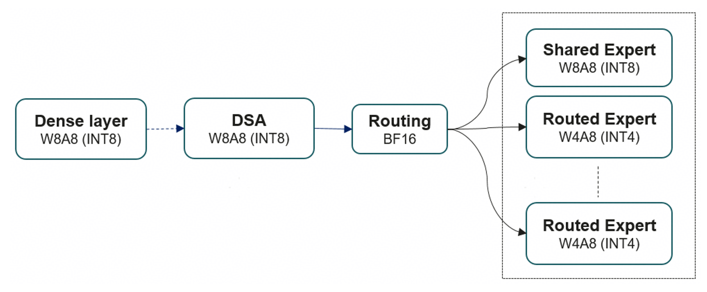 a)按模块区分量化比特与算法:例如Attention与MLP主体用W8A8,MoE专家用W4A8;gate等量化敏感层可按需回退,避免过大精度损失。