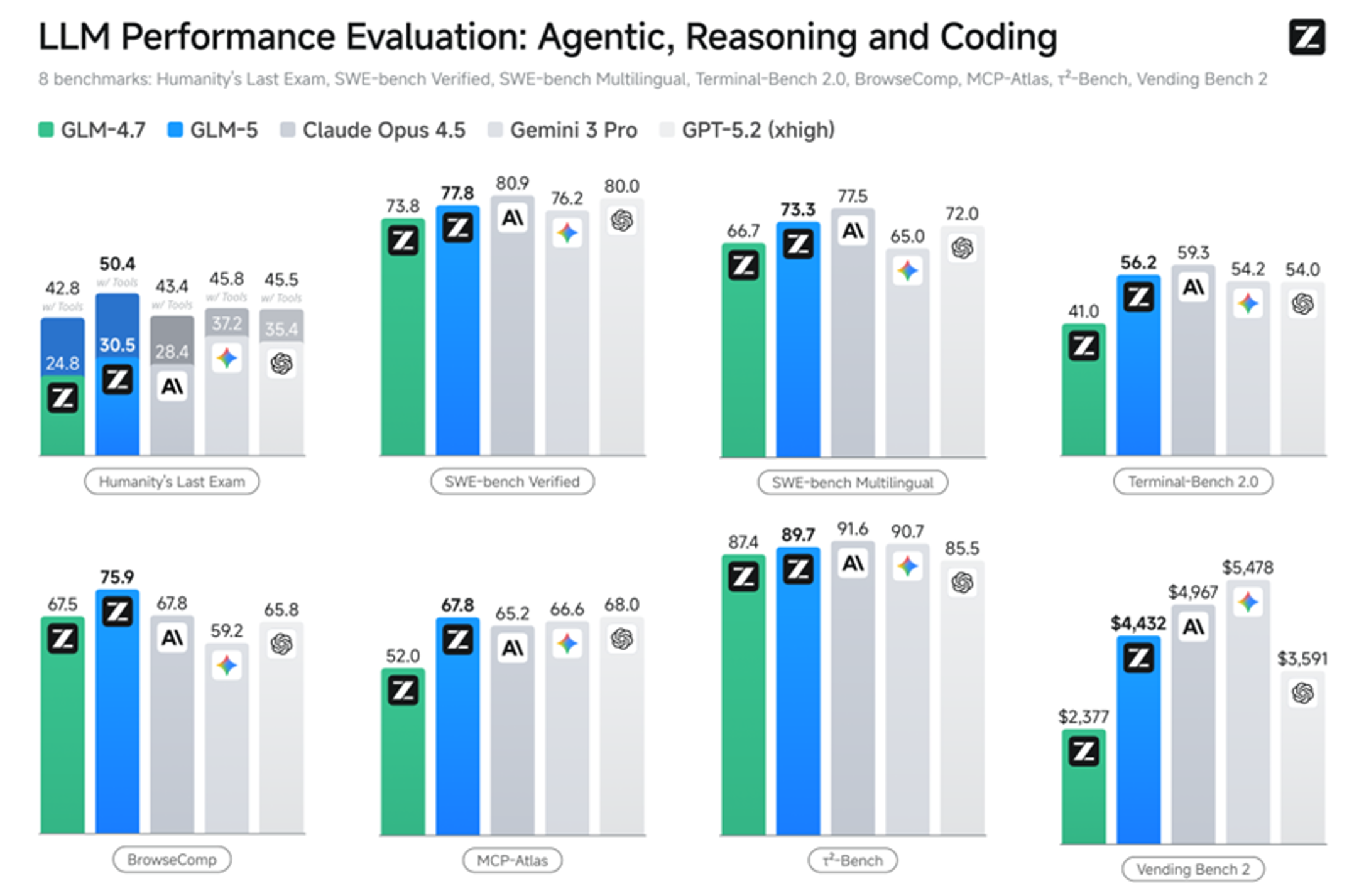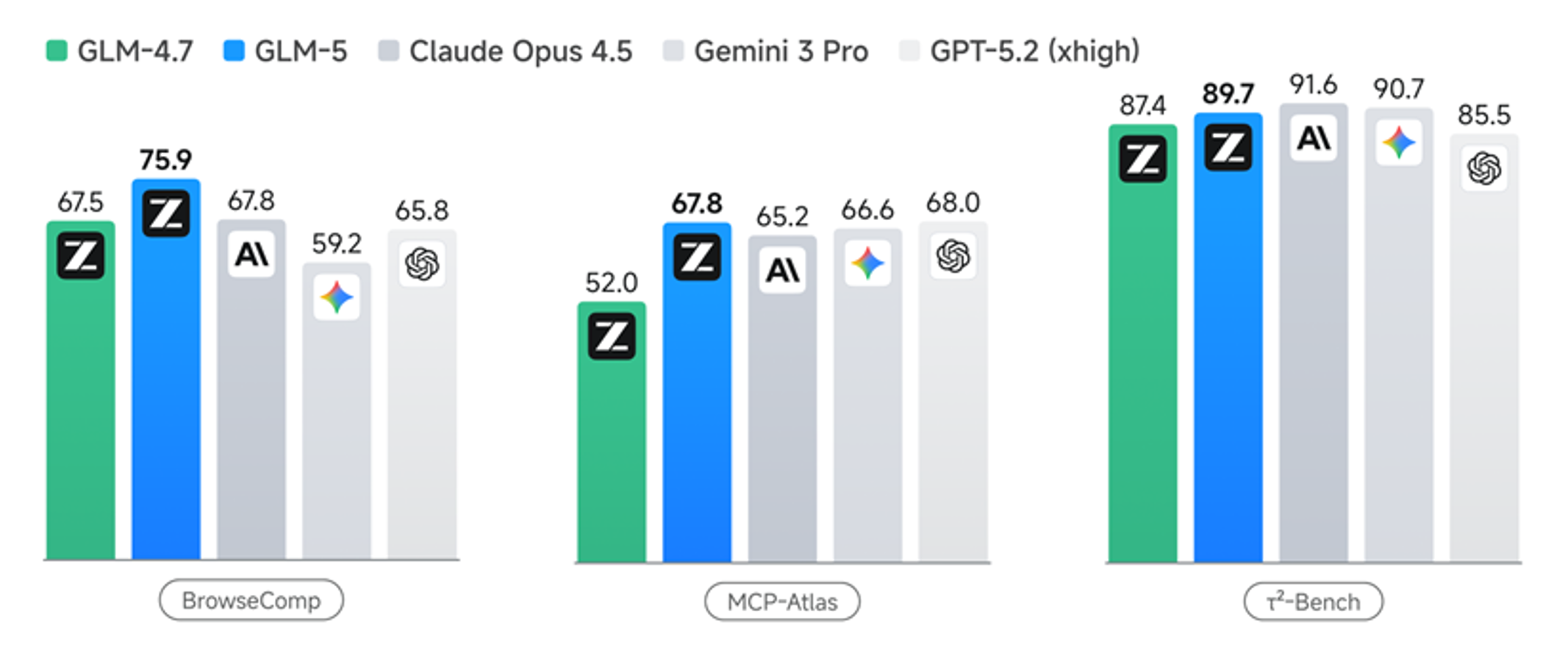 GLM-5在多个Agent测评基准中取得开源第一,在BrowseComp(联网检索与信息理解)、MCP-Atlas(工具调用和多步骤任务执行)和τ²-Bench(复杂多工具场景下的规划和执行)均取得最优表现。
