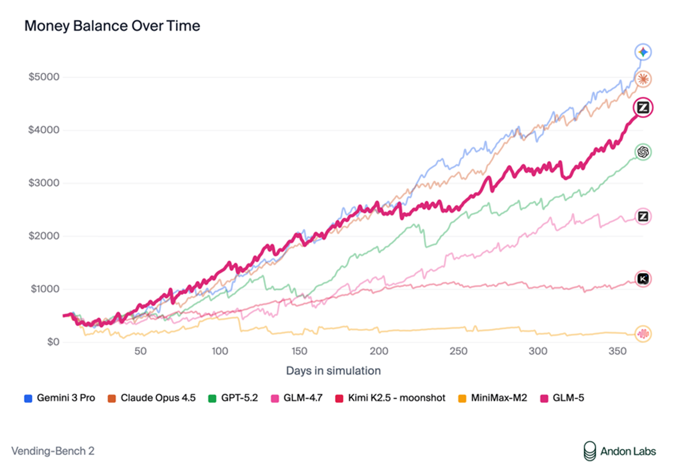 在衡量模型经营能力的Vending Bench 2中,GLM-5获得开源模型中的最佳表现。Vending Bench 2要求模型在一年期内经营一个模拟的自动售货机业务,GLM-5最终账户余额达到4432美元,经营表现接近Claude Opus 4.5,展现了出色的长期规划和资源管理能力。