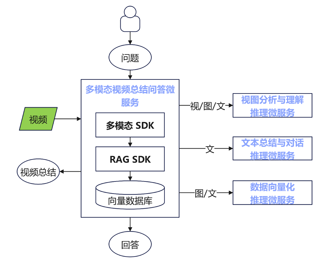 | 多模态视频总结问答应用微服务 | 应用微服务内包含了多模态SDK、RAG SDK、以及网页端服务脚本;多模态SDK是多模态视频总结问答应用的核心组件,它提供了智能分块、关键帧抽取、特征压缩等原子能力以剔除冗余数据,并提供了昇腾亲和的硬件解码、视频预处理等加速能力,使得开发者构建出性能更优的多模态应用。RAG SDK提供的知识检索召回加速能力用于高效、准确的提取高相似度的知识片段,便于后续进行问答对话。网页端服务脚本调用了这些能力。 |