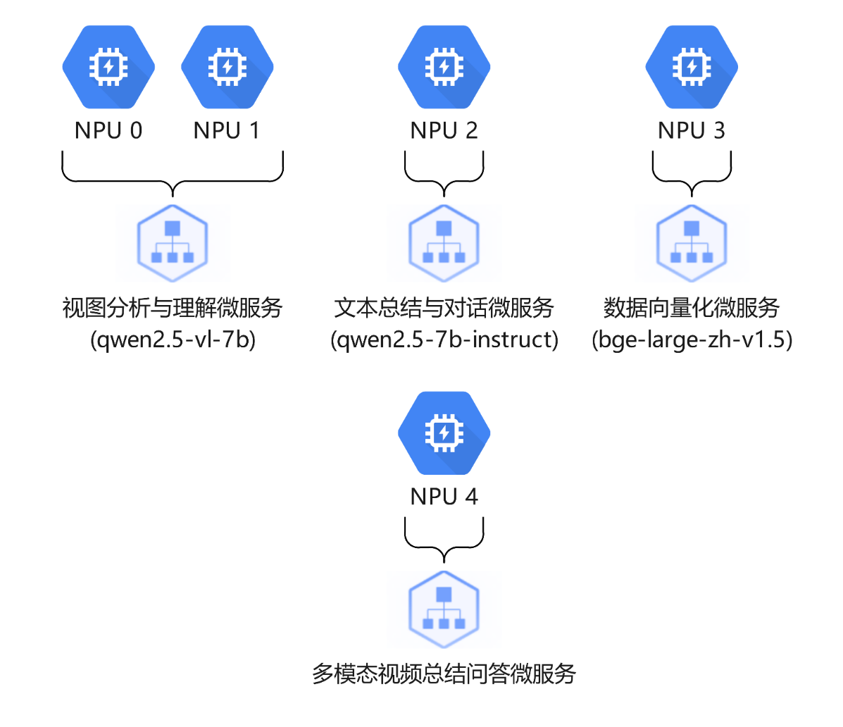 本应用基于Atlas 800I A2推理产品硬件平台,使用3个模型推理微服务(视图分析与理解推理微服务、文本总结与对话推理微服务、数据向量化推理微服务),加上多模态视频总结问答应用微服务,实现了总结问答应用的demo。其中,多模态视频总结问答应用微服务集成了多模态SDK、RAG SDK,其中也包含了预置的网页应用文件,实现了一站式部署。