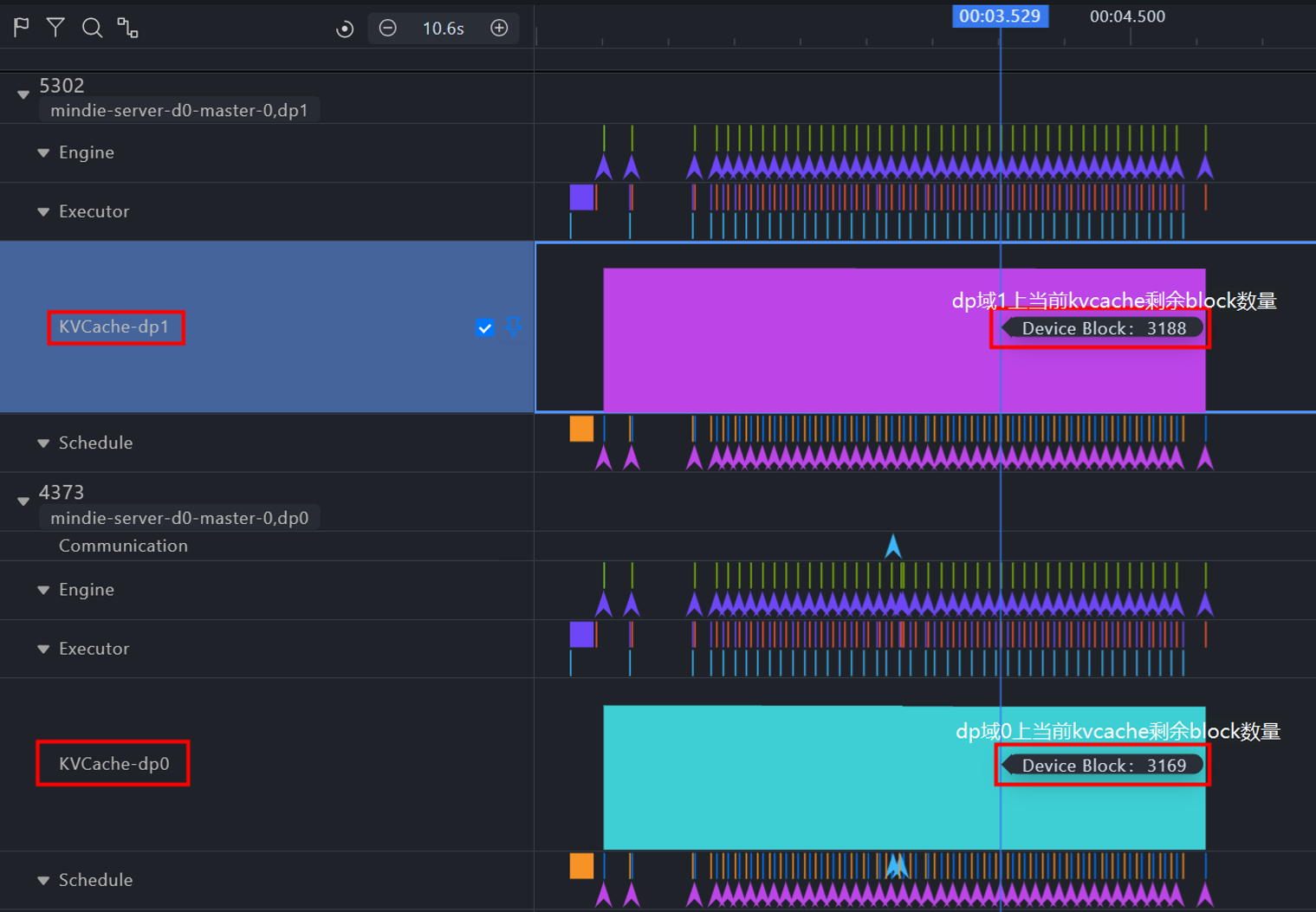 图3. 多DP域KVCache占用情况展示图。图中KVCache-dp0、KVCache-dp1两个泳道中分别展示了dp域0、1上当前kvcache剩余的block数量