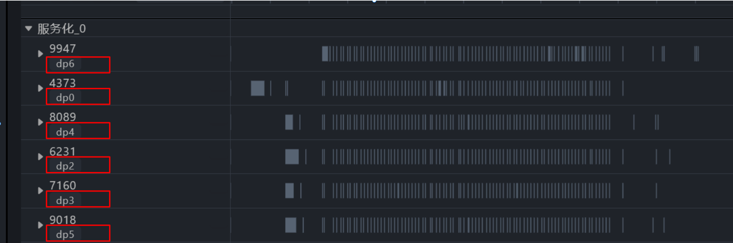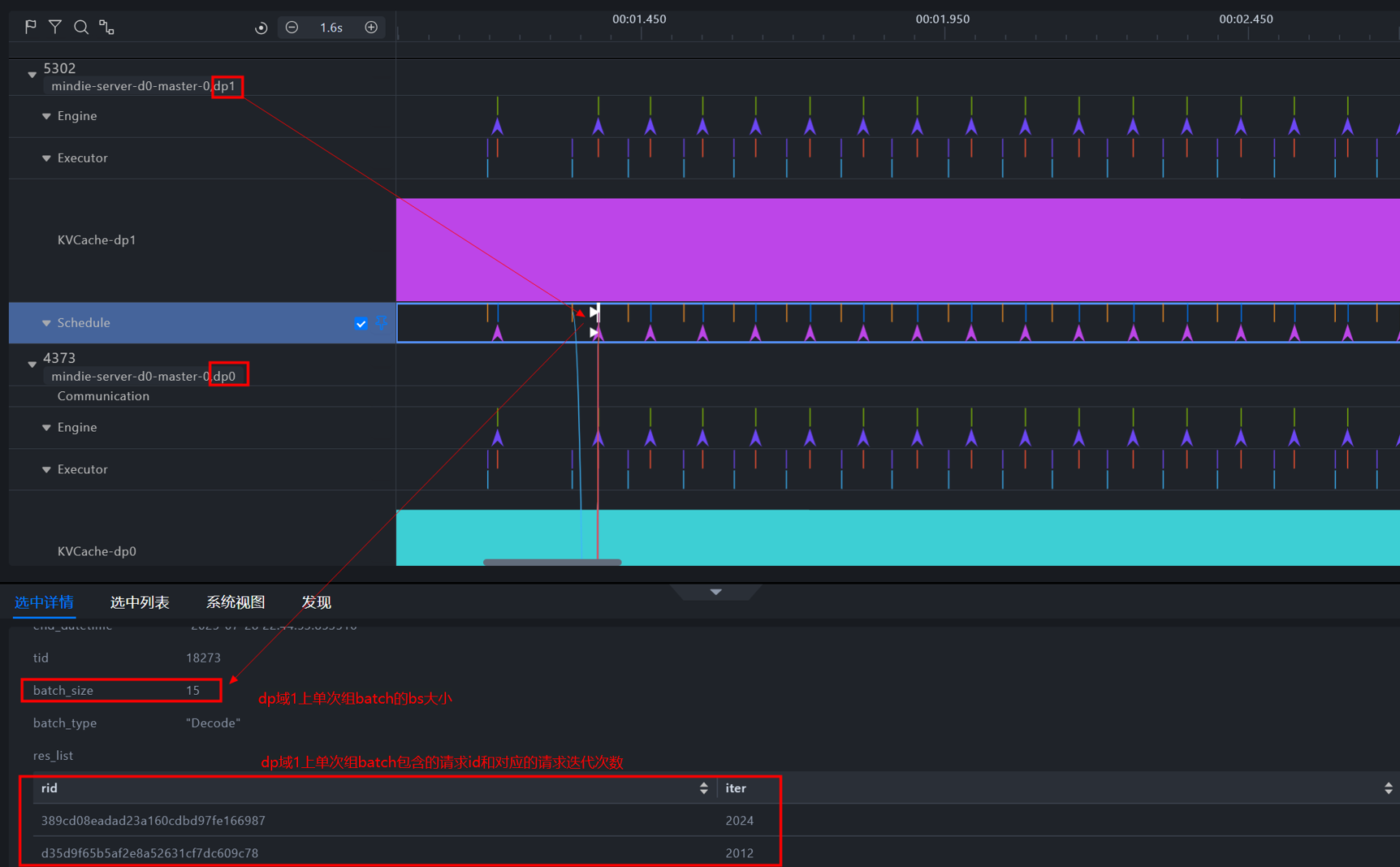 1. 如图1所示,采集工具给每个推理进程打上清晰的 dp_rank 标识,相当于发了“身份证”。每个 DP 域都有一条“泳道”,展示 batch size、KVCache 占用曲线,就像看交通路况图。