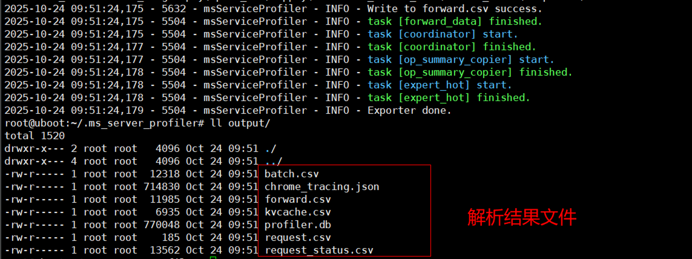--input-path需指定为数据采集中prof_dir参数设置的路径。解析完成后,默认在当前目录下生成output文件夹,其中包含上述CSV及可视化原始文件。如下图所示: