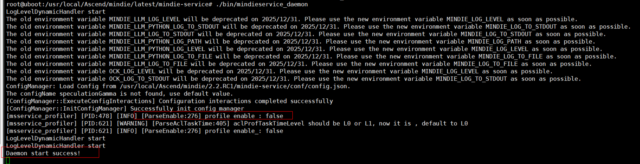 成功后会看到Daemon start success!日志,当前为未开启Profiling数据采集状态。