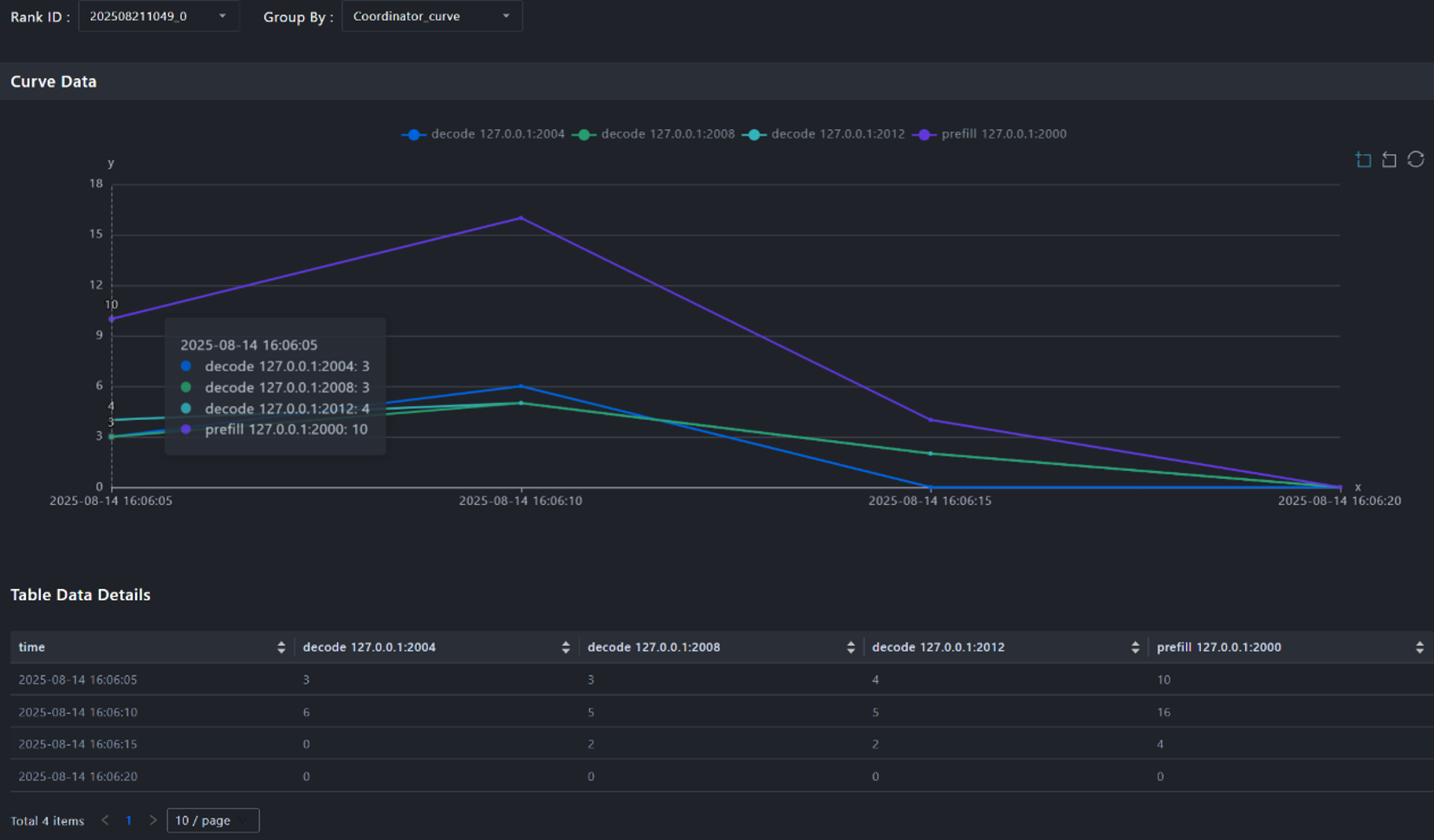 2. 工具提供折线图,直观展示各个节点在不同时刻的请求新增数量变化趋势。通过折线图,可以轻松识别出是否存在某个节点在特定时刻请求负载过高,发现负载倾斜问题。