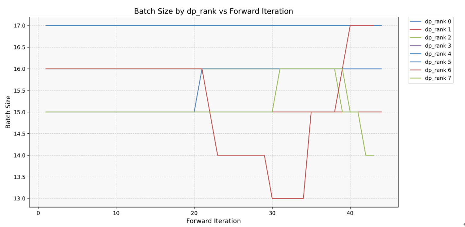 图5. 多DP域batch size变化折线图。基于图4 CSV文件生成的折线图,展示不同数据并行等级(dp_rank)下batch size随模型推理次数(forward_iter)的变化趋势