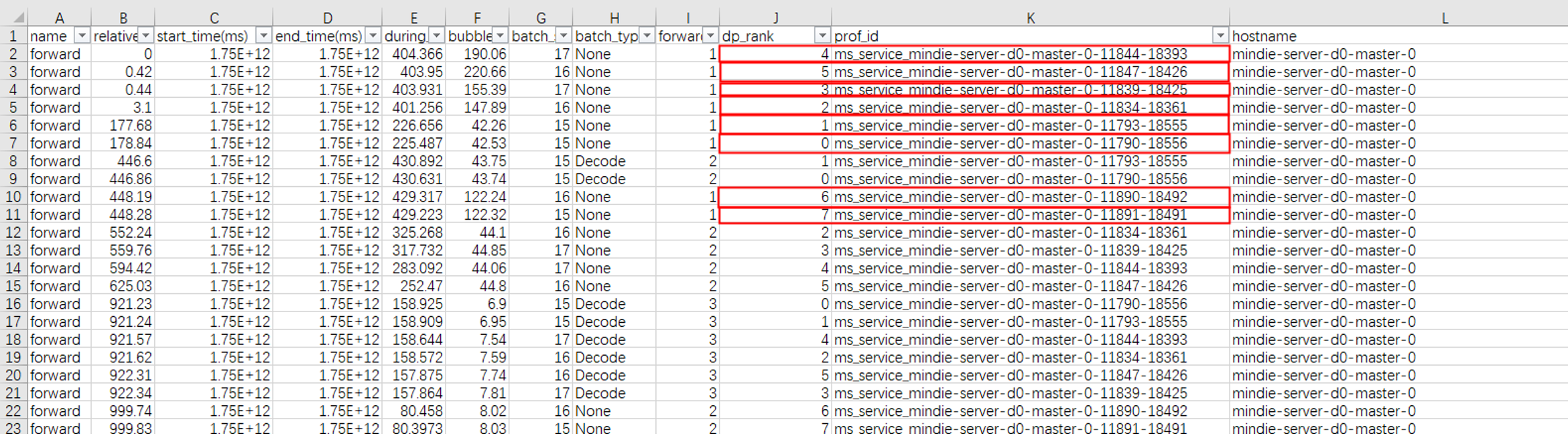 2. 工具还会导出 CSV,记录 prof_id(卡的唯一标识)、forward_iter(推理次数)、dp_rank(域归属),配合折线图一眼看到 batch size 异常波动。