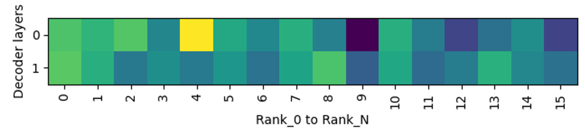 图8. Rank-Layer热力图:展示不同卡(rank0-rankN)在不同层(Decoder Layer)上的负载分布,从黄色(高频率)到绿蓝色(低频率)