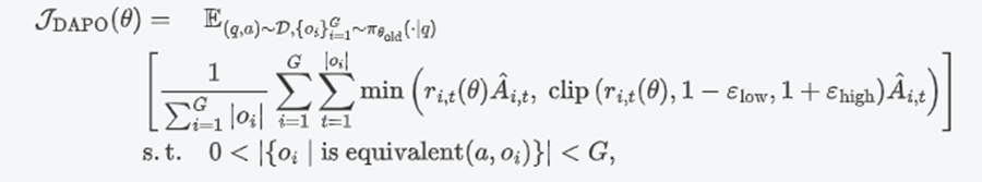 KL惩罚 | 直接去掉 KL 散度,允许分布大幅偏移,适配长 CoT 推理。 | 保留 KL 散度,防止偏离初始模型。 |
