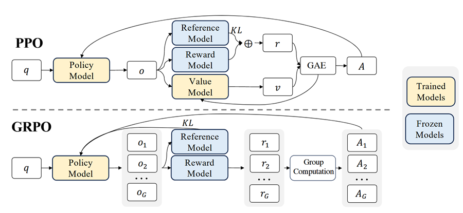 例如下图简要介绍了 GRPO 与 PPO 的整体流程及区别: