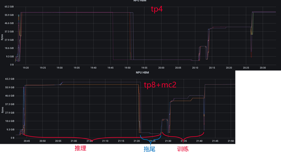 3、推理拖尾问题:观察显存占用,发现推理阶段由于推理随机性导致rollout样本长短不一,存在严重的拖尾现象,多数卡都已经推完的情况下仅有少数卡还在继续推理,拖尾时间达到推理部分的30%以上。