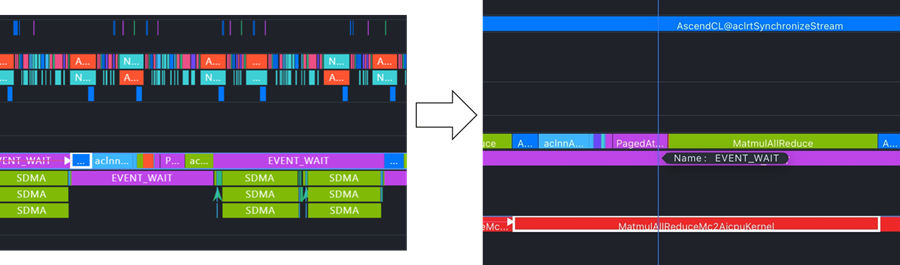 mc2融合算子的使用需要结合TP切分调优。我们分析,TP=4场景下,多数时间设备资源是处于拖尾空泡,mc2通算掩盖收益不明显,需要做更大的TP切分TP=8,TP=8带来的通信开销结合mc2能达到通算掩盖,从而减少拖尾,我们调优发现:1)不开启mc2,TP=4 -> TP=8,性能略微下降;2)开启mc2,TP=4 -> TP=8,性能提升约5%。