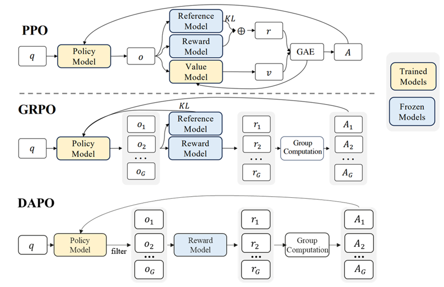 图1 PPO、GRPO、DAPO三种强化学习算法的流程对比图