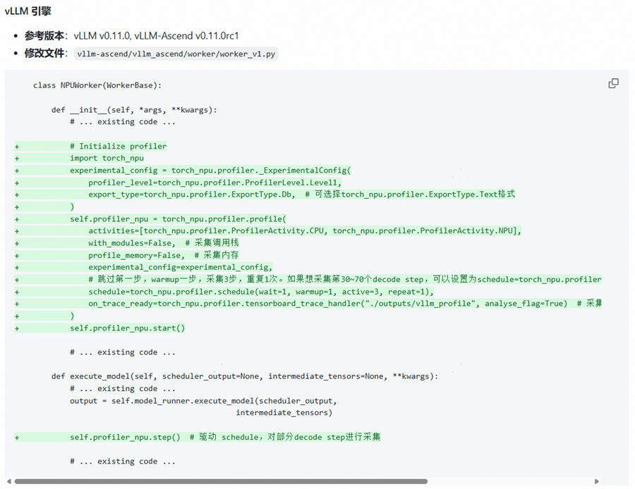 为解决推理阶段的SPMD模式切换到vLLM acync server模式导致Rollout过程profiling采集生效的问题,目前昇腾已在verl社区发起了一个PR: https://github.com/volcengine/verl/pull/4320。截止发稿,该PR尚未合入,未合入时可以使用以下昇腾提供的临时解决方案,如下图所示: