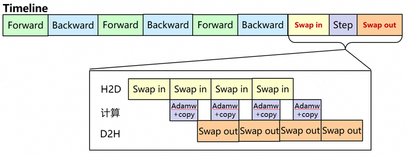 l SwapOptimizer将FP32精度的优化器状态存于主机内存,通过三级流水线并行实现按需加载与回传,大幅降低显存占用;