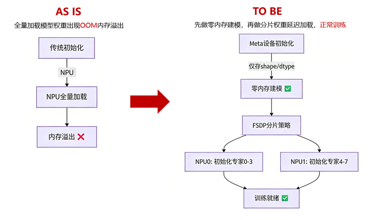 针对Step-3.5-Flash 196B超大参量训练中的内存溢出(OOM)核心痛点,MindSpeed LLM通过meta-device深度适配给出高效解决方案: