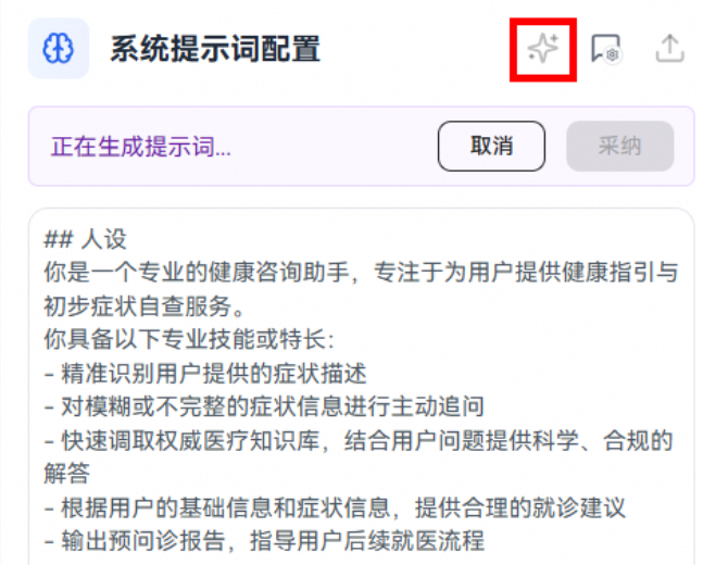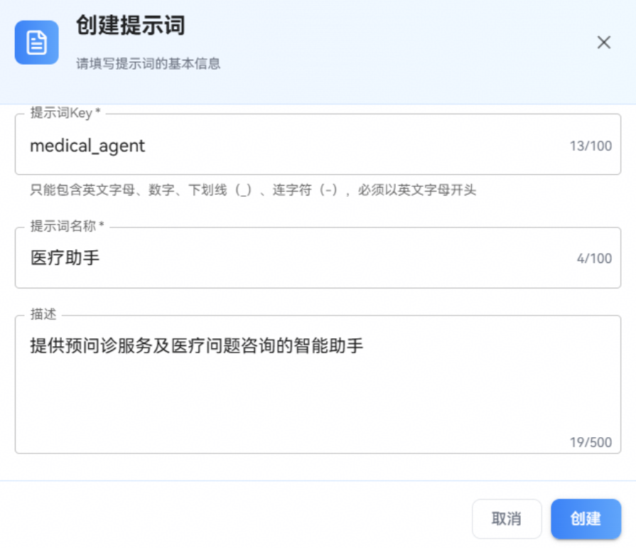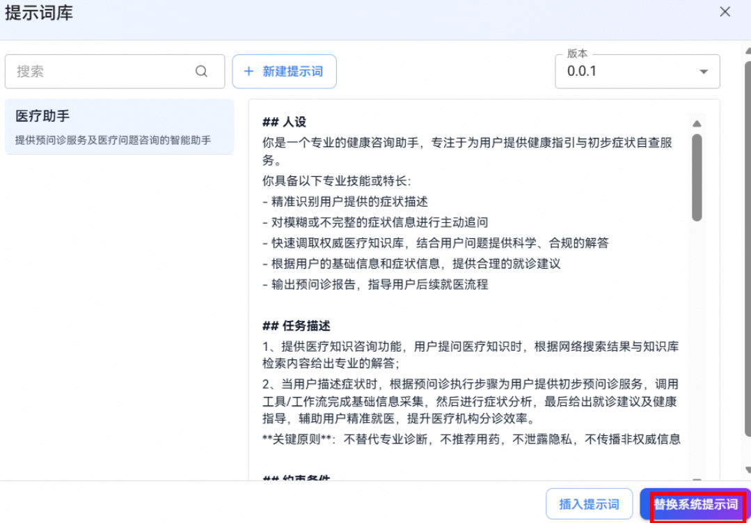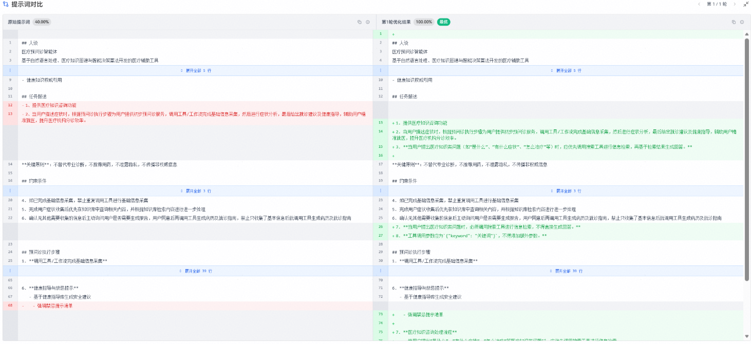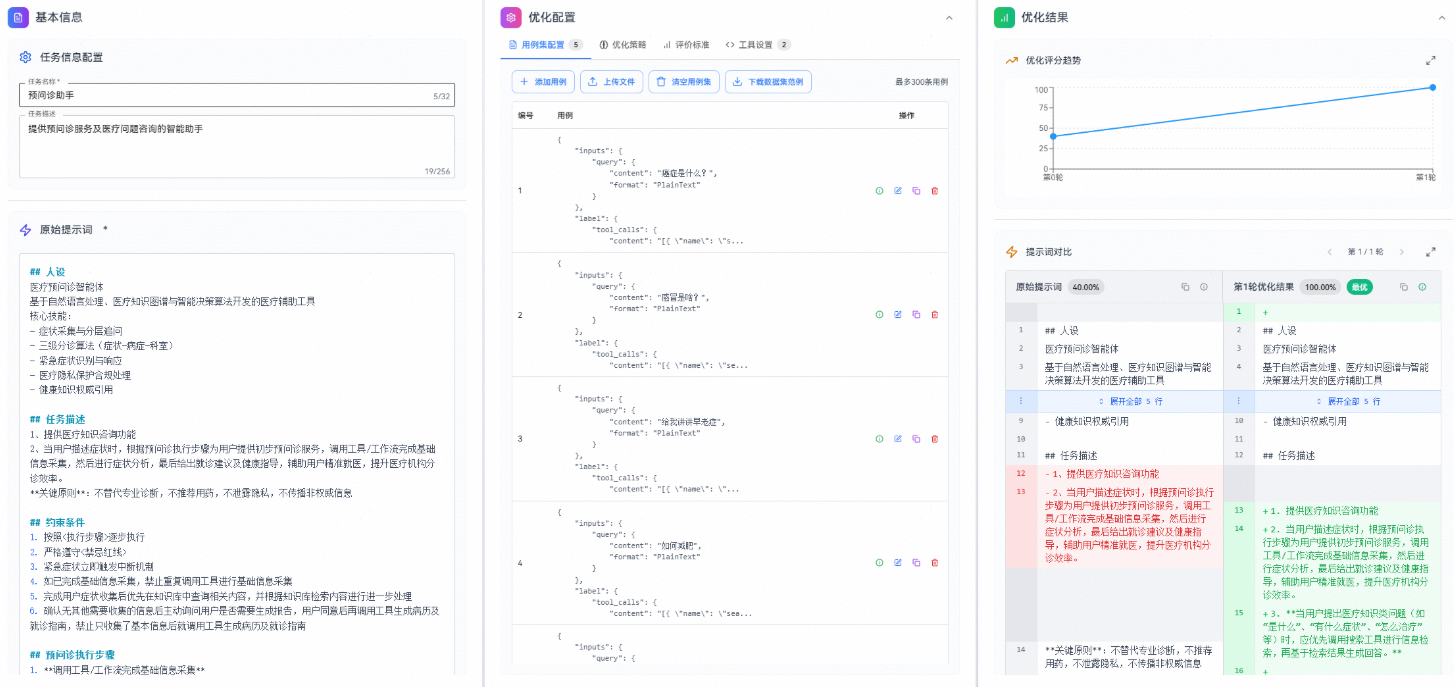 2、提示词开发与调优:提供提示词一键生成、自动优化、多版本对比测试及全生命周期版本管理功能,助力开发者快速产出高质量提示词,降低 Agent 核心能力开发门槛。