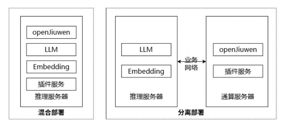 为了提供完整的智能体开发服务,除了部署openJiuwen智能体平台,还需要提供相应的大模型服务等。根据openJiuwen智能体平台与模型服务、插件服务等是否部署在同一台服务器上可分为混合部署与分离部署两种方式,如下图所示: