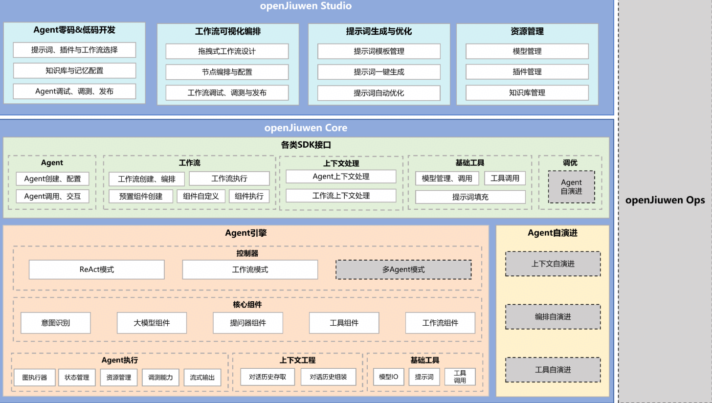 openJiuwen的系统架构主要由openJiuwen Core、openJiuwen Studio和openJiuwen Ops三大部分组成。
