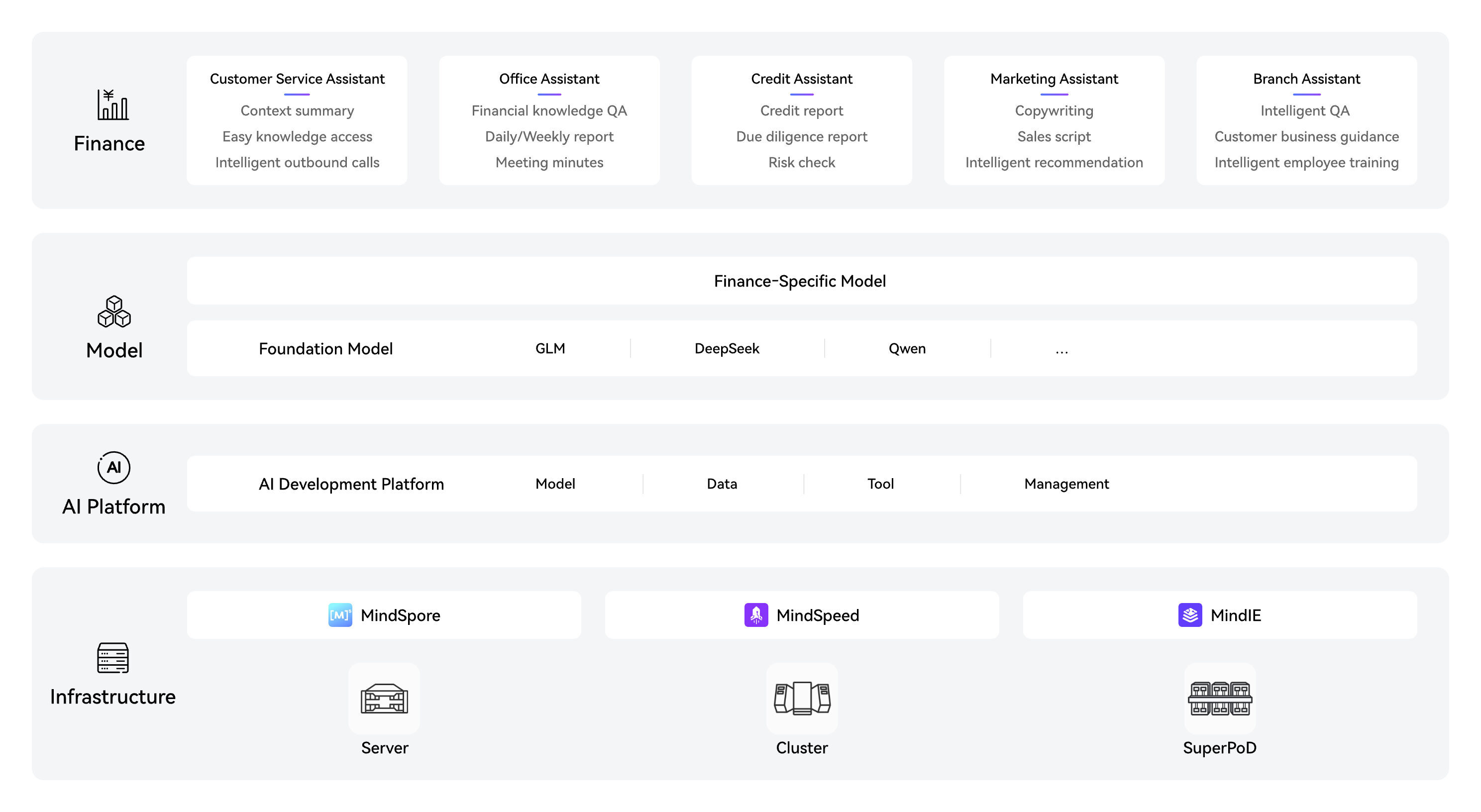 A foundation model supports the full loan process. Before application, it analyzes data to help create credit reports. During application, it assesses credit history and repayment ability to generate due diligence reports. After approval, it aids in risk checks and post-loan analysis.