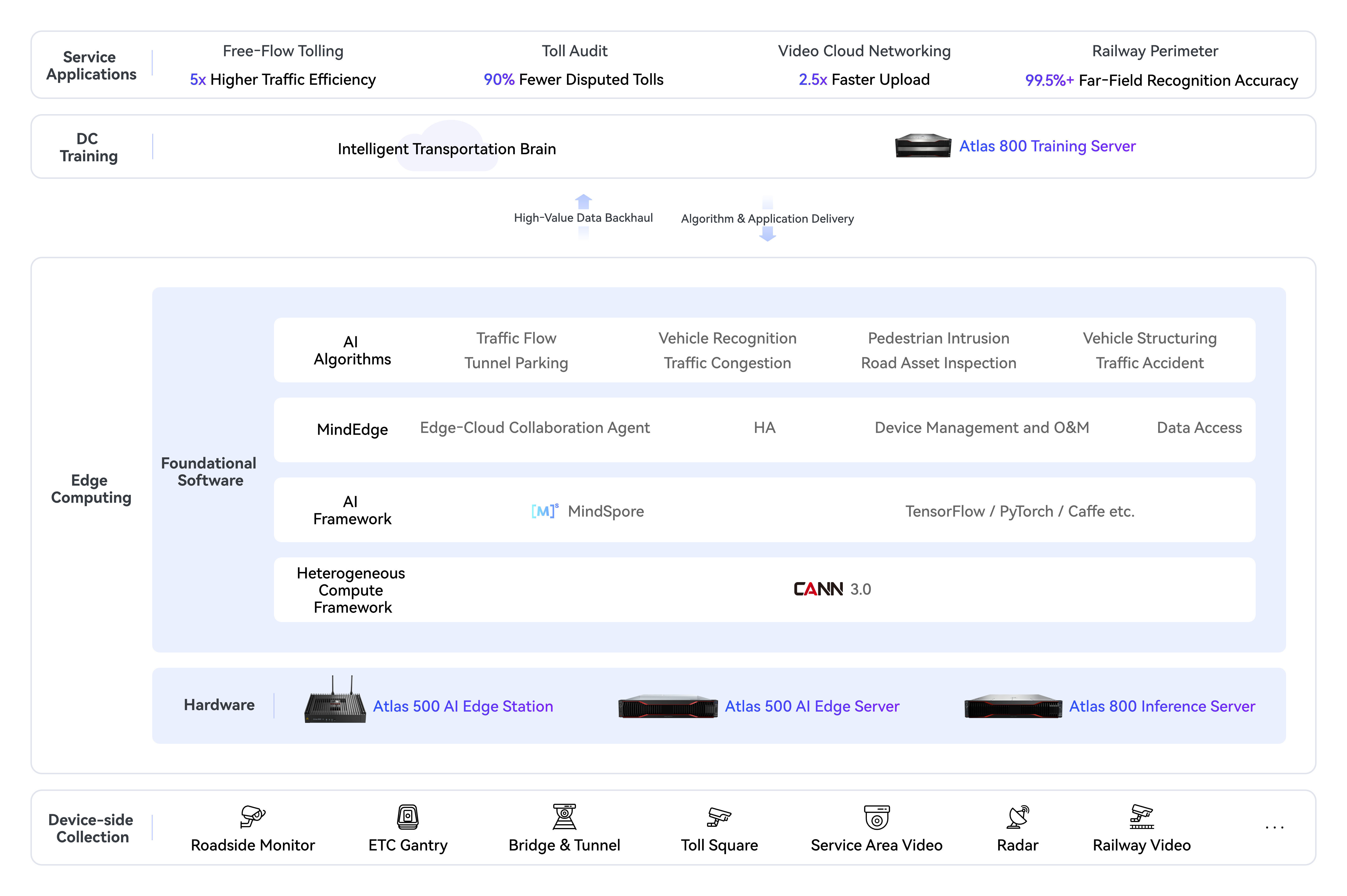 Ascend Intelligent Transportation leverages AI technologies to enhance traffic analysis of vehicle movements, and alleviate congestion, thereby boosting overall travel efficiency. The Ascend Intelligent Transportation Solution is designed for typical traffic AI applications such as free flow toll collection, toll audit, video cloud networking, and vehicle-road synergy.