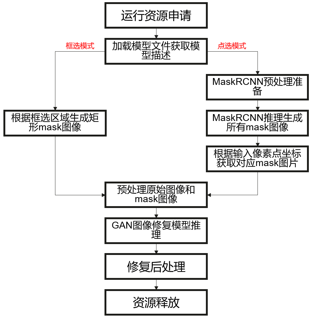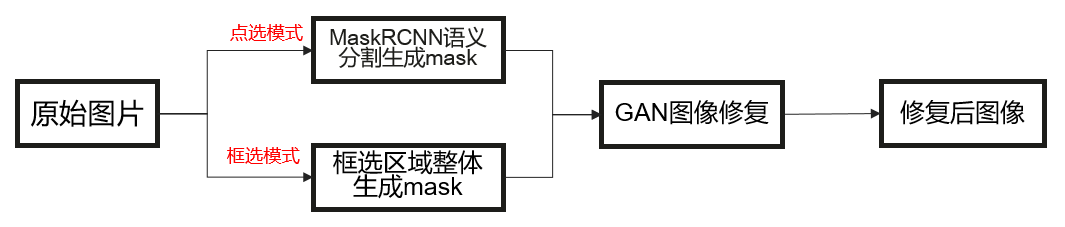 由上图可知,不管哪种模式,都需要生成需要消除区域的mask后,再调用GAN图像修复模型进行图像修复。但是这两种模式也都各有优劣,以下做一个简单的优势介绍。