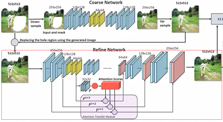 修复Mask内的图像就是要利用相似度从Mask外找到与Mask内待修复Patch相似性高的Patch,在编码器的低层将Mask外的Patch与以对应的注意力分数作为权值相乘后再相加得到待修补Patch内的特征值。