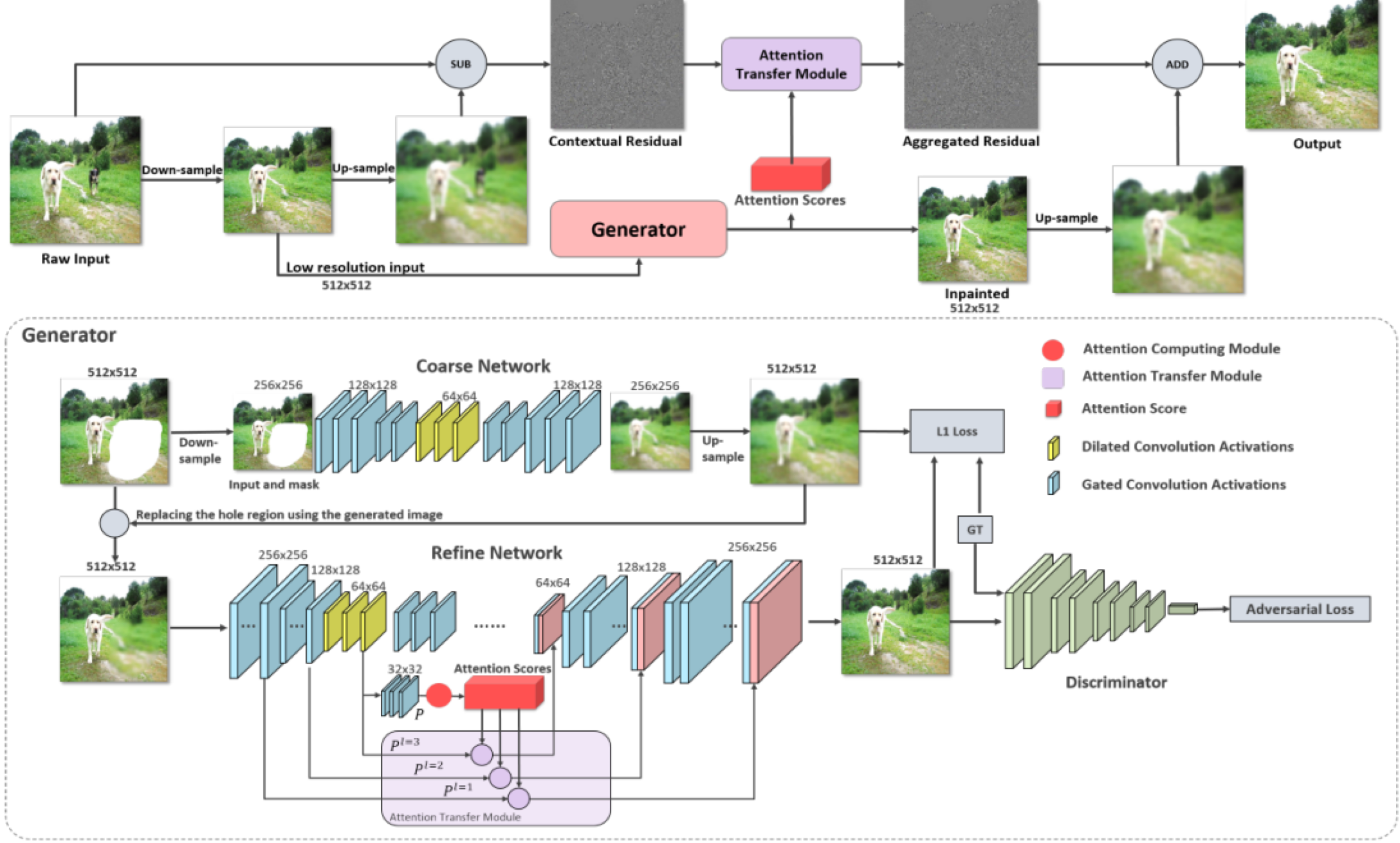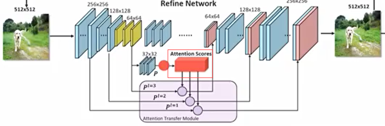 注意,生成器除了生成了一张512x512的修复后他图像,还输出了一个注意力矩阵(1024 x 1024),CRA矩阵就是利用该注意力矩阵实现了进一步的精修。