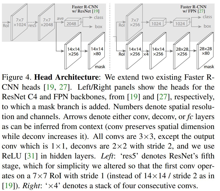 为了产生对应的Mask,文中提出了两种架构,即左边的Faster R-CNN/ResNet和右边的Faster R-CNN/FPN,如下图所示。我们这里采用的是右边的架构。