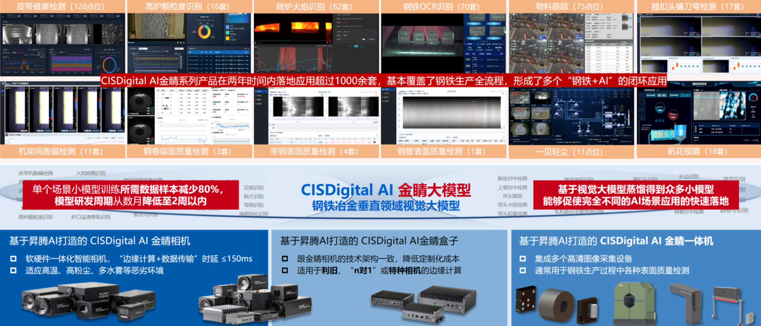 为了应对钢铁行业长期面临数据复杂、场景多样、缺陷数据稀缺等难题,在重庆人工智能创新中心的支持下,中冶赛迪信息技术(重庆)有限公司基于自主研发的工业领域视觉大模型——“CISDigital AI金睛大模型”和昇腾AI基础软硬件平台打造了金睛智慧工厂解决方案,依托2000万张钢铁行业高质量图像数据,构建“基于行业大模型的钢铁冶金全流程机器视觉数据集”,打造出安全、自主、创新的工业视觉大模型,突破了传统AI在领域知识复用难、场景泛化不足等瓶颈,形成了覆盖全流程的系列产业化应用体系。