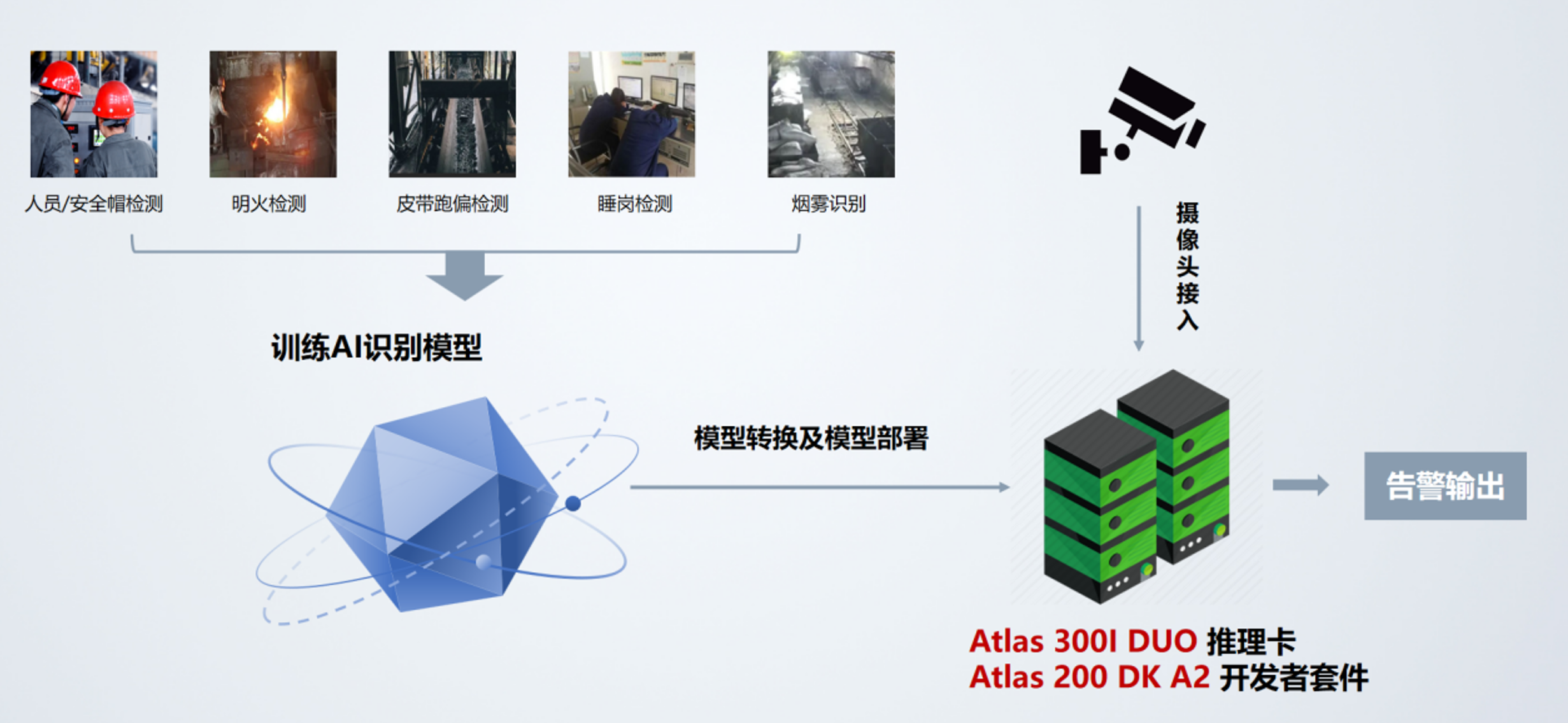 金睛智慧工厂解决方案基于机器视觉对人员/安全帽检测、明火检测、皮带跑偏检测、睡岗检测、烟雾识别等钢铁生产全流程的异常状态和生产状况进行识别,通过将训练好的AI识别模型,部署在Atlas 300I DUO 推理卡和Atlas 200 DK A2开发者套件,接入摄像头设备进行视觉检测,实时输出告警信息给管理人员完成闭环处理。